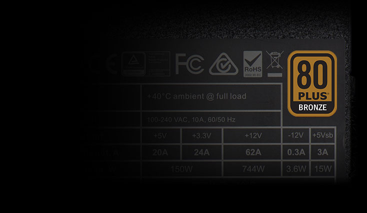 Certificación 80 Plus Bronze asegura que su fuente de alimentación no malgaste poder convirtiéndolo en exceso de calor. Bajo cargas típicas estas fuentes de alimentación tienen 85% de eficiencia o superior.