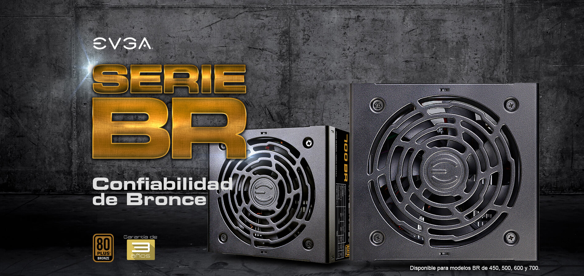la nueva serie de fuentes de poder EVGA BR. Construidas sobre nuestra ya gran linea de fuentes con certificación Bronze, decidimos hacer las mejoras que nuestros clientes pidieron. Nuestra linea BR cuenta con certificación 80 Plus Bronce, con eficiencia del 85% o más bajo cargas típicas. Tiene un diseño no-modular con cables negros totalmente mallados para una excelente estética, fan silencioso de 120mm, mayor estabilidad en los rieles de 5V/3.3V, y todo cubierto por la garantía lider de EVGA de 3 años.