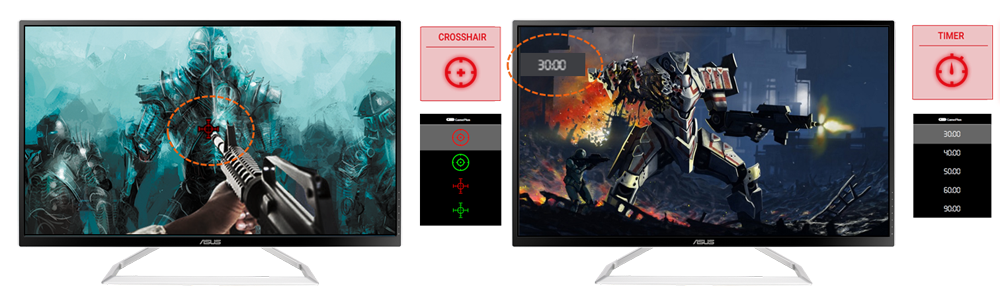 Cuando se trata de diseño, ASUS siempre tiene en mente a sus clientes – El ASUS VA325H integra la exclusiva tecnología de ASUS de Atajos GamePlus con funciones crosshair y timer. Los jugadores pueden elegir entre cuatro diferentes tipos de crosshair para combinar con el ambiente de juego; mientras que el timer mantiene a los jugadores conscientes del tiempo transcurrido en los juegos de estrategia en tiempo real. Estas herramientas permiten a los jugadores practicar y mejorar sus habilidades.