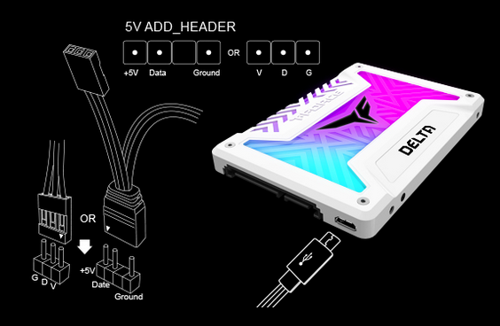 La unidad SSD T-FORCE DELTA RGB (5 V) es adecuada para placas madre que tienen un conector ADD de 5 V (como se muestra a continuación)[2]. Proporciona una variedad de efectos de luz cambiantes. No solo se puede lograr un brillo uniforme de la superficie, sino que también puede presentar un magnífico efecto de color mixto con iluminación que asemeja el movimiento fluido del agua para maximizar la variabilidad del color. Cuando se instala en el conector ADD de 5 V de la placa madre, el efecto de luz se puede controlar y sincronizar a través de la placa madre para lograr un entorno de control de iluminación integral.