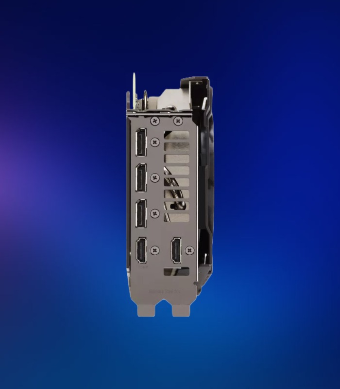 La parte trasera de la tarjeta revela una serie de mejoras. La placa protectora de metal cuenta con un orificio de ventilación que permite que el aire caliente escape hacia los extractores del chasis, en lugar de reciclarse con el aire frío. El soporte de conexiones de acero inoxidable protege los puertos y facilita un proceso de montaje más seguro. Y el interruptor Dual Bios permite seleccionar los modos rendimiento y silencio sin tener que recurrir al software.