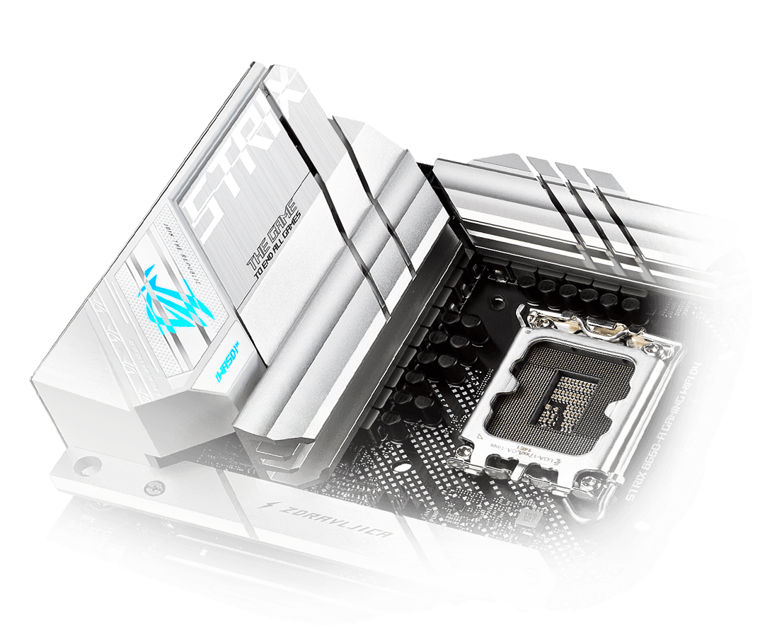 El ROG Strix B660-A Gaming WiFi D4 llamará la atención con un llamativo acabado blanco plateado que contrasta con un audaz logotipo con efecto de falla iluminado con Aura RGB. Mientras tanto, las franjas paralelas y el texto punteado en la cubierta de E/S de aluminio, los disipadores térmicos M.2 y PCH unen toda la estética y subrayan los fundamentos de velocidad, diversidad y actitud de ROG Strix.