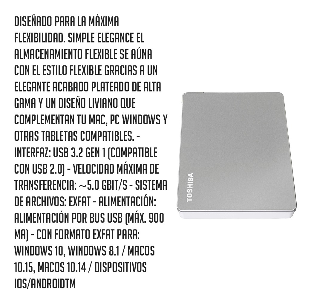 Canvio Flex combina compatibilidad y portabilidad, y es la solución de almacenamiento entre dispositivos creada para tu estilo de vida digital. Para poder probar nuevos dispositivos, necesitamos libertad de elección. Por eso el Canvio Flex está diseñado para funcionar de manera intercambiable con las principales plataformas y sistemas operativos. Esta unidad preformateada para Mac, PC Windows y tabletas* te permite acceder a tus datos y compartirlos entre dispositivos sin el menor problema. Disfruta de un almacenamiento cómodo y flexible con Canvio Flex: tu compañero de almacenamiento inteligente.