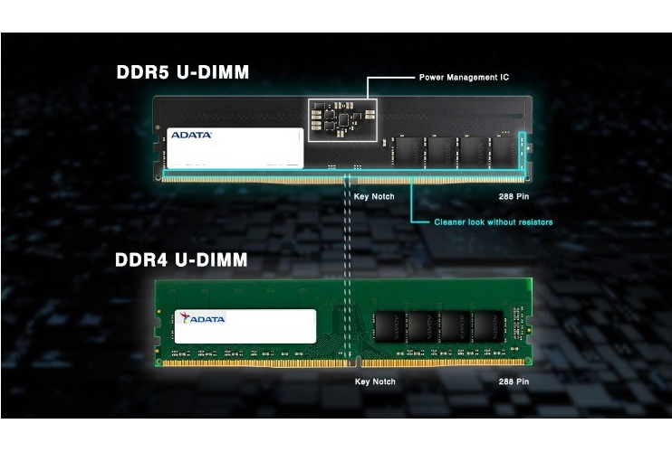 Los módulos DDR5 U-DIMM tienen las mismas dimensiones y número de clavijas que los módulos DDR4. La diferencia más obvia es la posición de la muesca a toda prueba. Además, DDR5 integra resistores de E/S con resistores CMD/ADD. Además, la apariencia de los módulos DDR5 es más limpia que la de DDR4. Además, puede ver un PMIC en el centro.